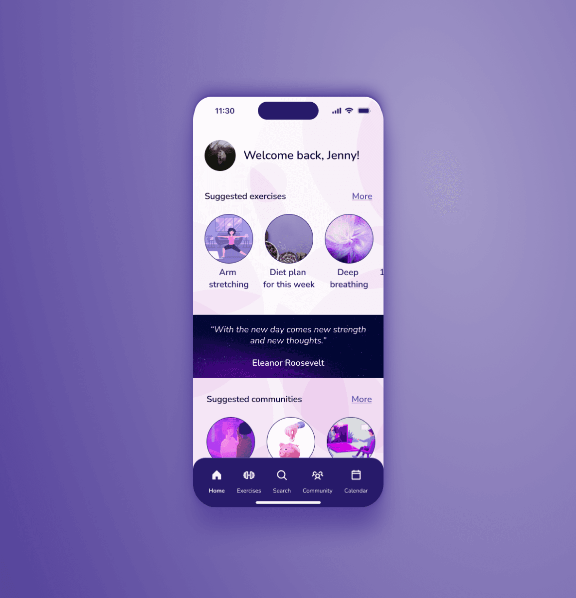 The page enables users to explore suggested and popular exercises, as well as suggested and trending communities. Users are greeted with a daily motivational quote, and they can access their profile and profile settings.