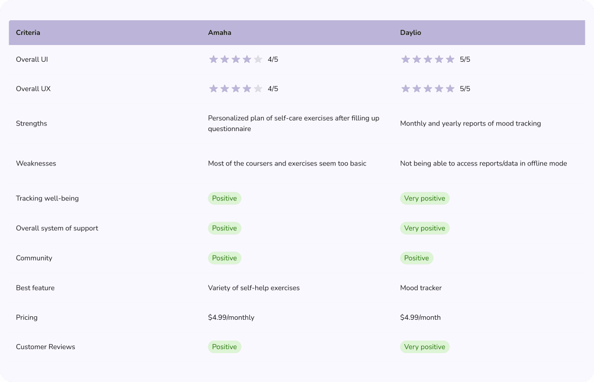 The purpose of this analysis was to examine mental health apps available in the marketplace and the features and services they offer to end users. This analysis helped us gain insights into user needs and identify features to incorporate into our app.