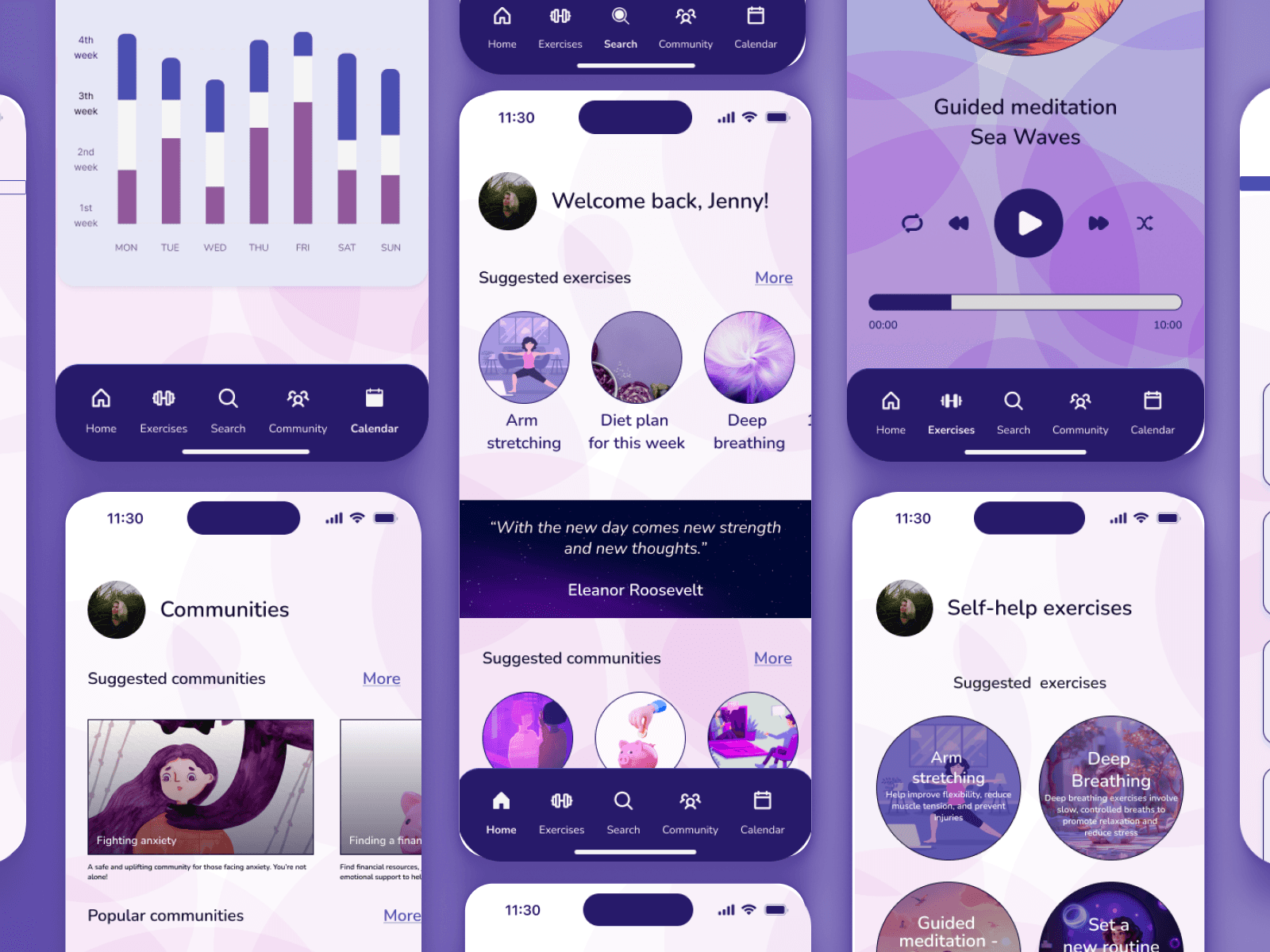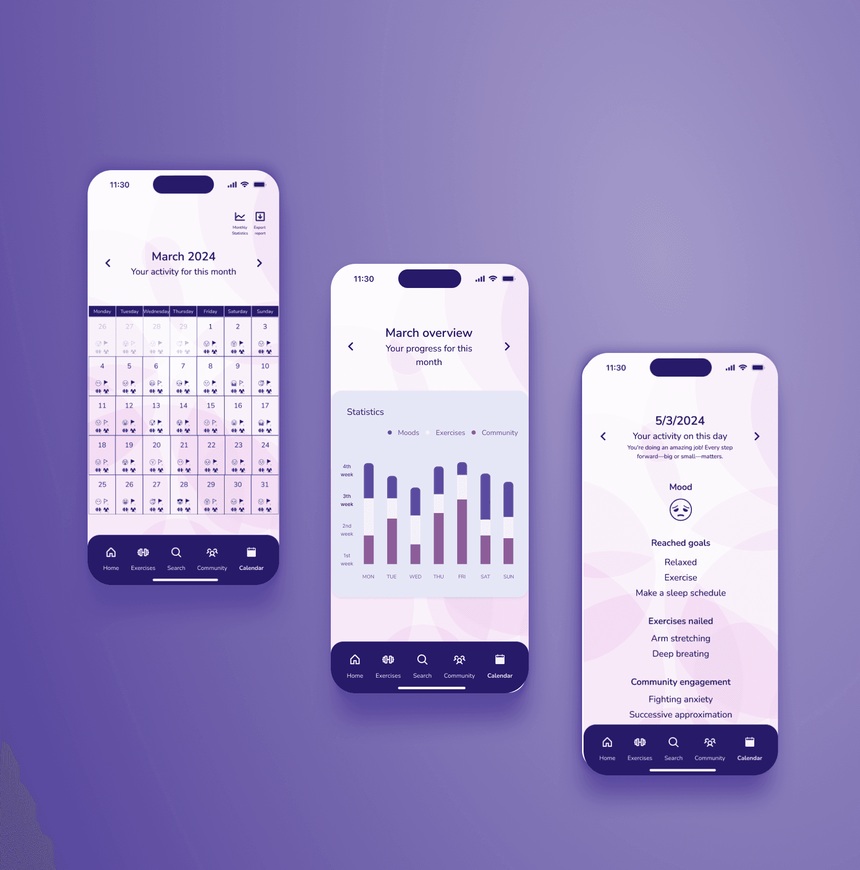These pages offer users a comprehensive monthly and yearly overview of their well-being. Each date displays helpful information about their mood, completed exercises, and community involvement. Furthermore, users can gain insights into their overall well-being and progress through detailed monthly and yearly statistics, along with the option to download informative reports.