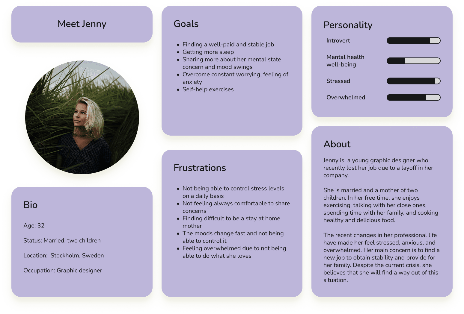 Jenny feels stresses and overwhelmed because of the current professional situation. She doesn’t feel empowered to share her throughs and emotions to her close people. But, she decided to find online community supervised by phycologists and self-help exercises to help herself in improving her well-being.