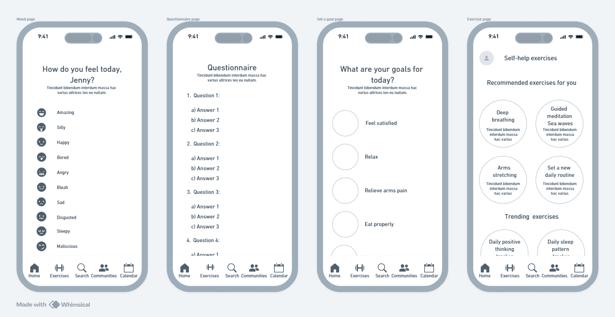 The pages empowers users to select their current mood, complete an insightful questionnaire, and establish daily goals. By analyzing the collected information, it confidently recommends tailored exercises and communities to enhance mental health of user.