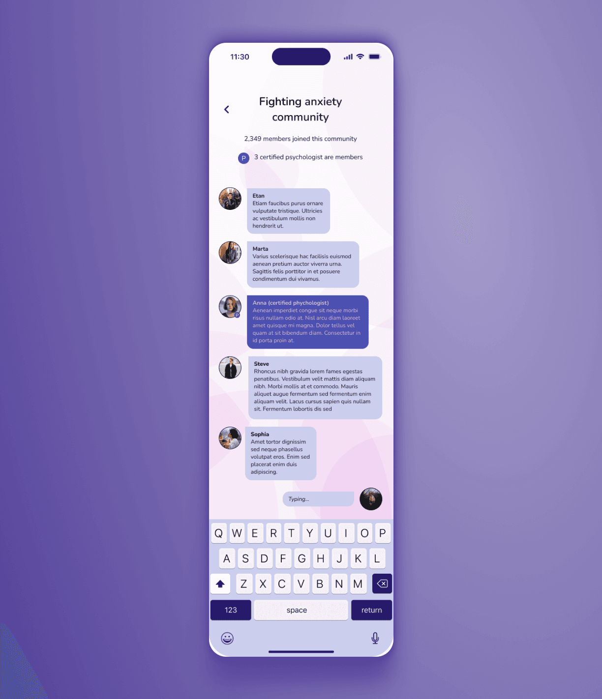 This page empowers users to connect seamlessly with fellow app users. Each community is expertly overseen by certified CBT psychologists, guaranteeing that conversations remain focused on the community topic. The psychologists are administrators of the communities, ensuring that it is a safe space for users to share their feelings and thoughts while providing them with useful tips and suggestions.